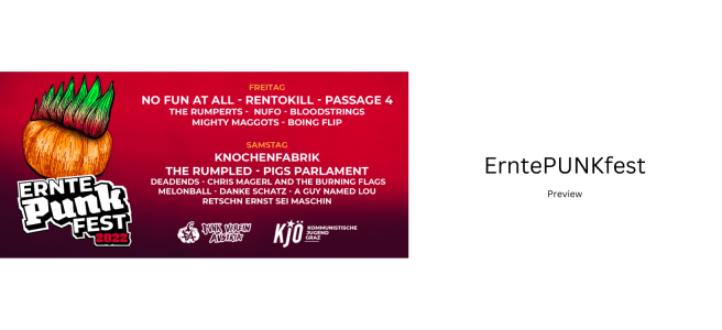 Für alle Punk-Begeisterten ist kommendes Wochenende (7. und 8. Oktober) ein Pflichttermin! Die Rede ist vom ErntePUNKfest, dem größten Punk-Festival der Steiermark. Die dritte Runde des ErntePUNKfests bringt allerdings kleinere Änderungen mit sich. Im Gegensatz zu den Jahren 2019 und 2021 findet die 22er-Edition erstmals an zwei Tagen statt. Außerdem wandert das Festival vom Taggerwerk … Buntes Punk-Wochenende mit dem ErntePUNKfest weiterlesen