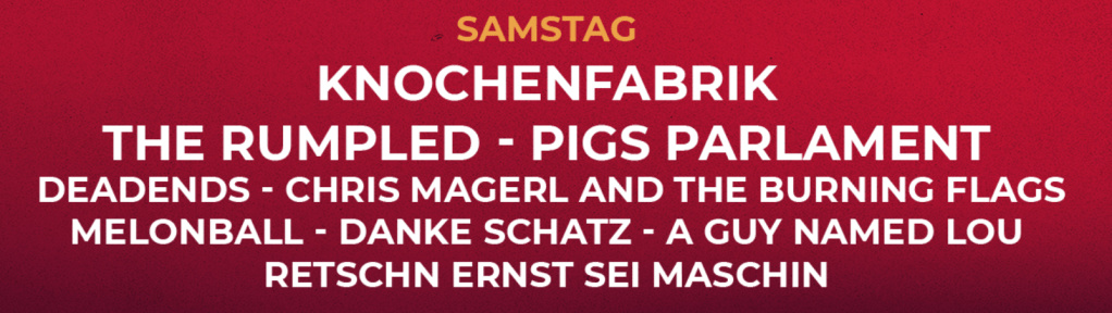 Der Samstag gestaltet sich in musikalischer Hinsicht durchaus bunter. Wenngleich am Freitag Skate-Punk dominiert, sind an Tag zwei auch Ska-, Folk- und Deutsch-Punk-Bands vor Ort. Neben A Guy Named Lou, Dankeschatz, Melonball, Chris Magerl & the Burning Flags und Dead Ends spielen die slowenische Ska-Punk-Metal-Band Pigs Parlament, die italienischen The Rumpled mit irischem Folk-Rock und die legendäre Deutsch-Punk-Band Knochenfabrik auf den Bühnen der S.T.R.E.S.S.-Tubes. Retschn Ernst sei Maschin sorgt als Late-Night-Act für Gaude! 🙂
