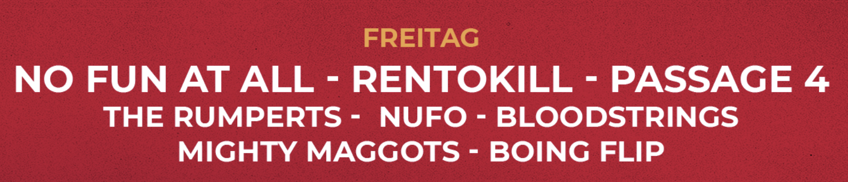 Am Freitag gastieren unter anderem Boing Flip, Mighty Maggots, Bloodstrings, NUFO und The Rumperts am ErntePUNKfest. Zu den Headlinern zählen die schwedische Skate-Punk-Band Passage 4, Rentokill Hardcore-Punk aus Österreich und die schwedischen Punk-Urgesteine No Fun At All.